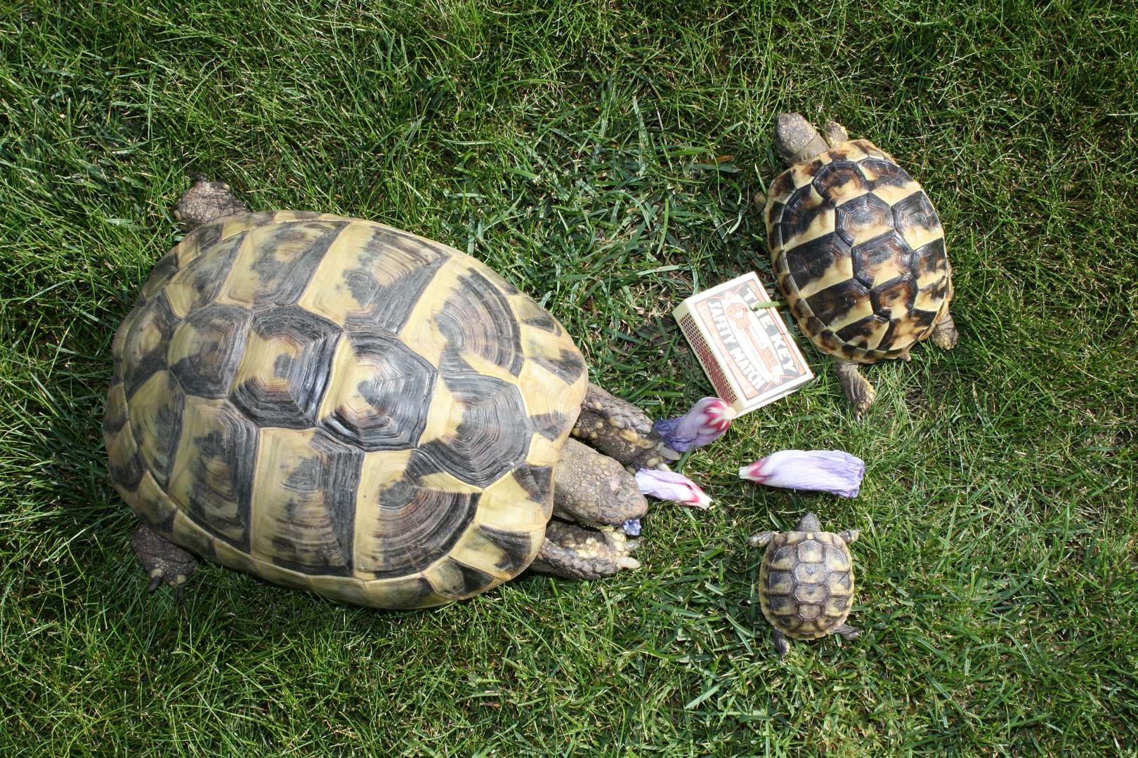 Tři generace spolu – dospělá samice váží přes 1500 g, roční mládě kolem 150 g měří cca 8 cm, měsíc staré mládě má 23 g a 4 cm.