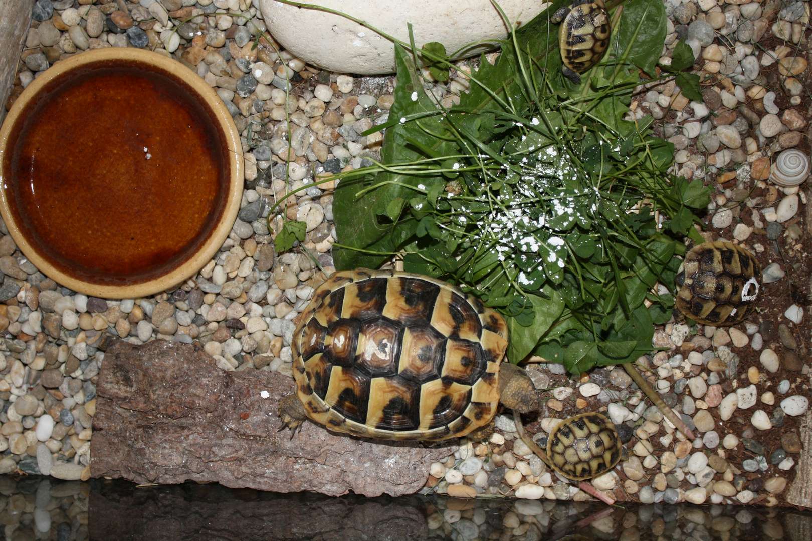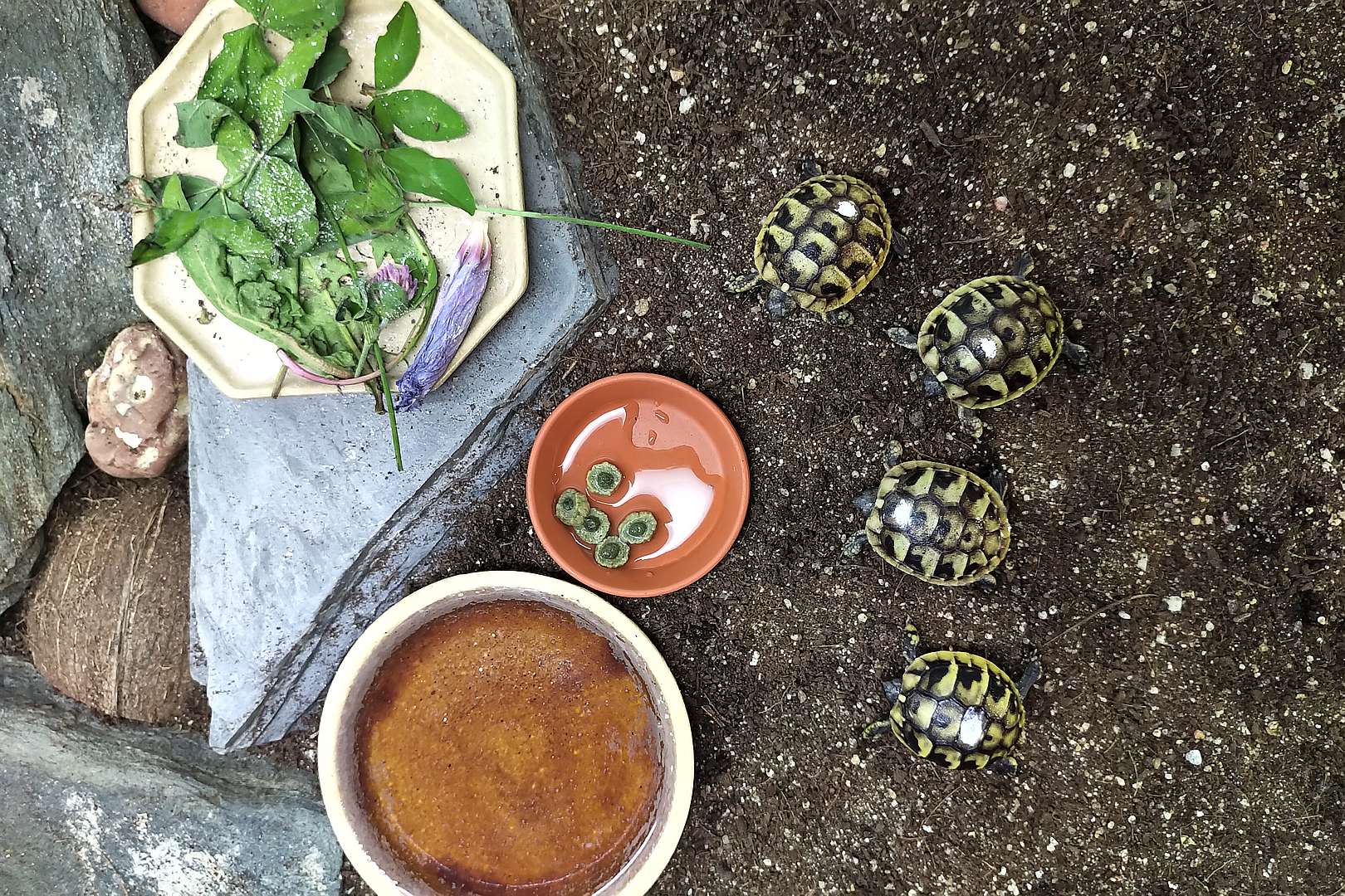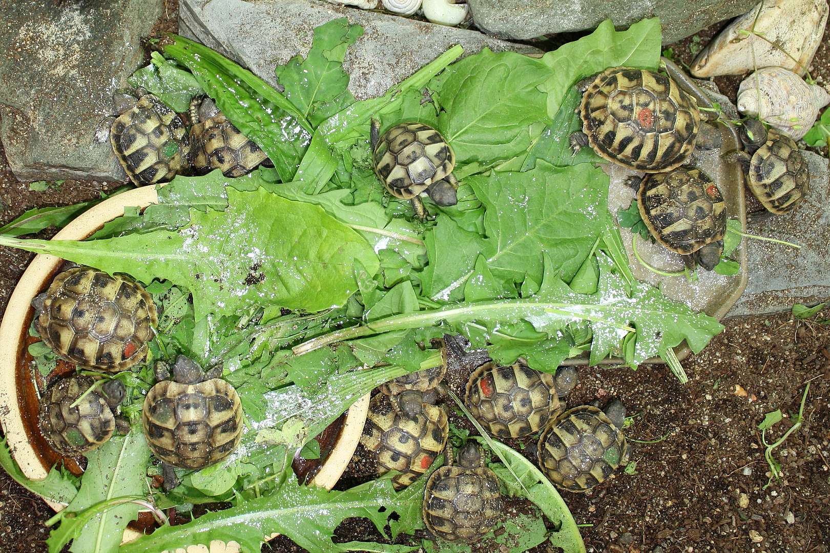 Základem stravy je pampeliška, jitrocel a jetel. Misky pod květináč poslouží na krmení i na vodu. Ta nesmí ve výběhu chybět.
