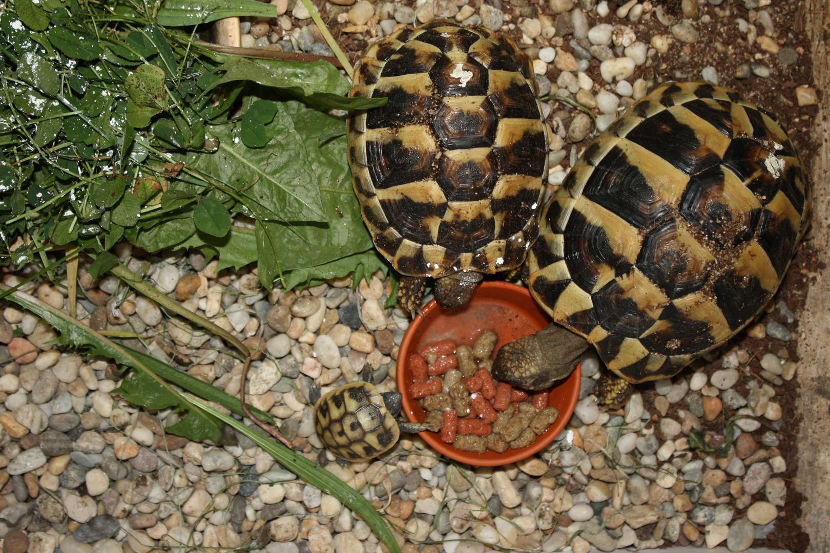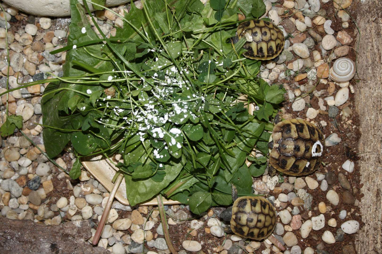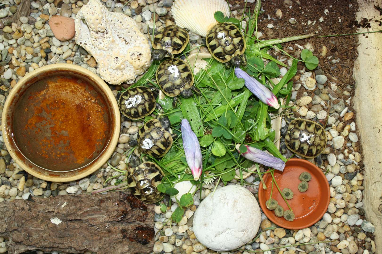 Základem stravy je pampeliška, jitrocel a jetel. Misky pod květináč poslouží na krmení i na vodu. Ta nesmí ve výběhu chybět.
