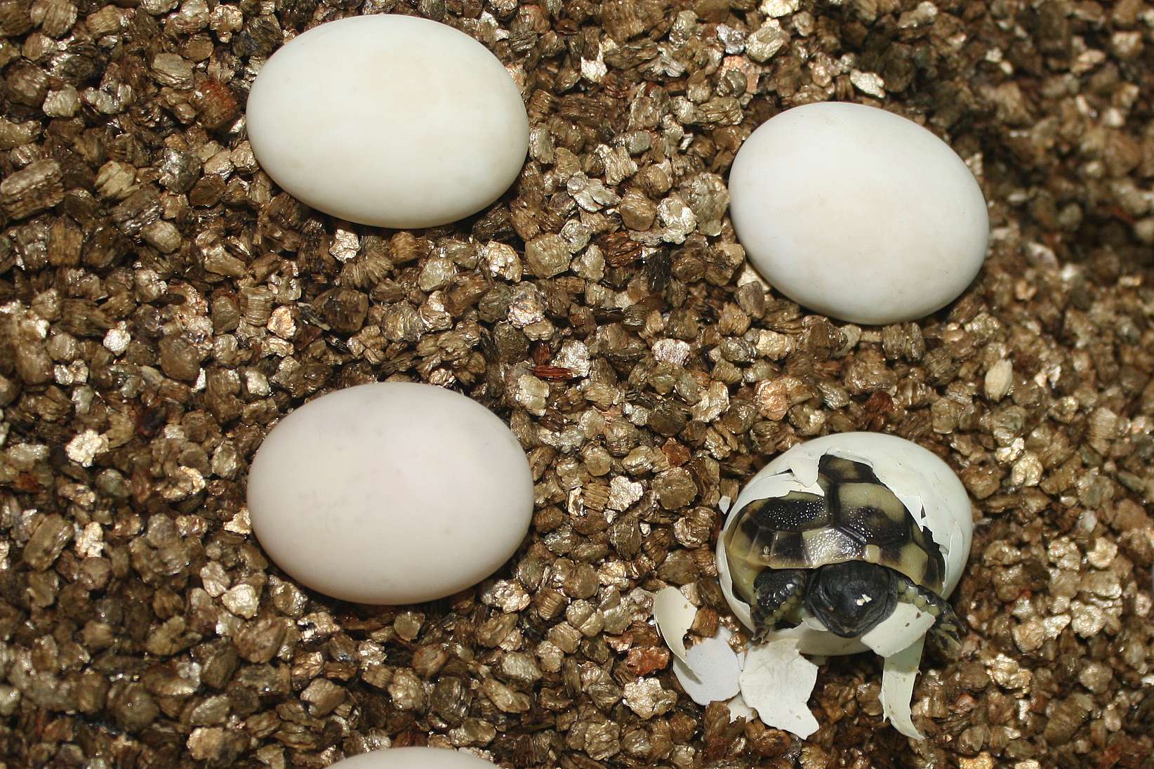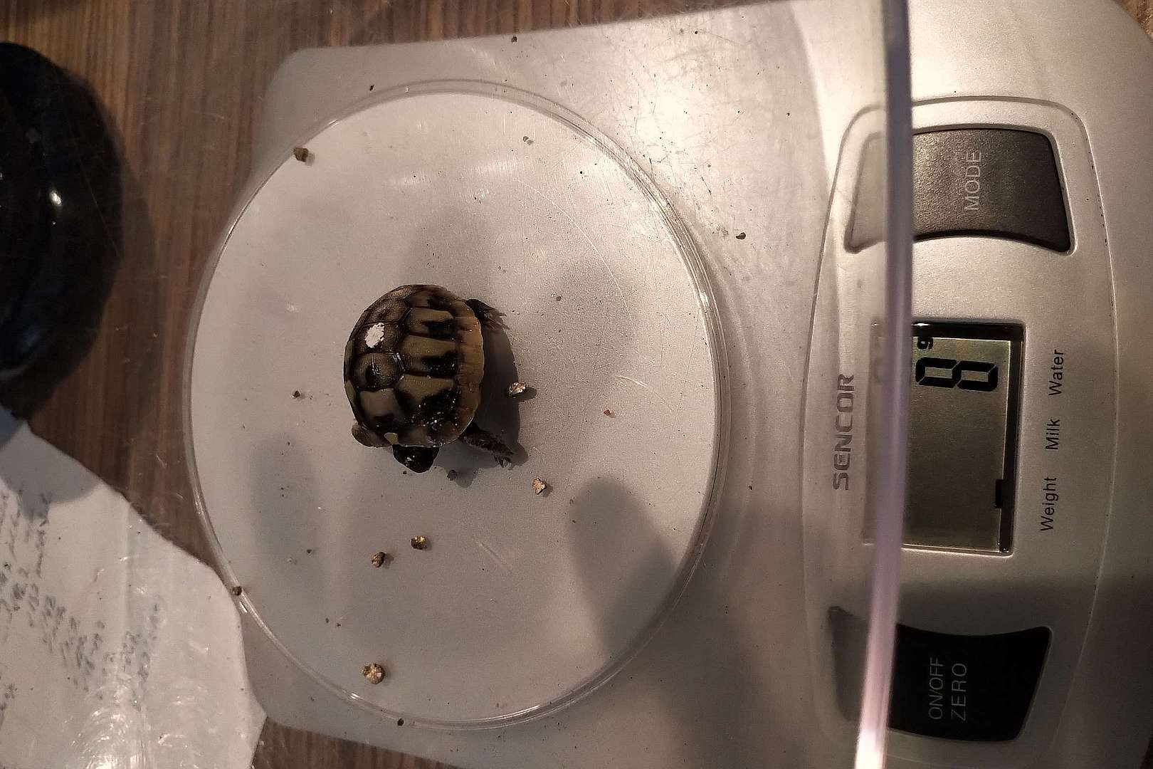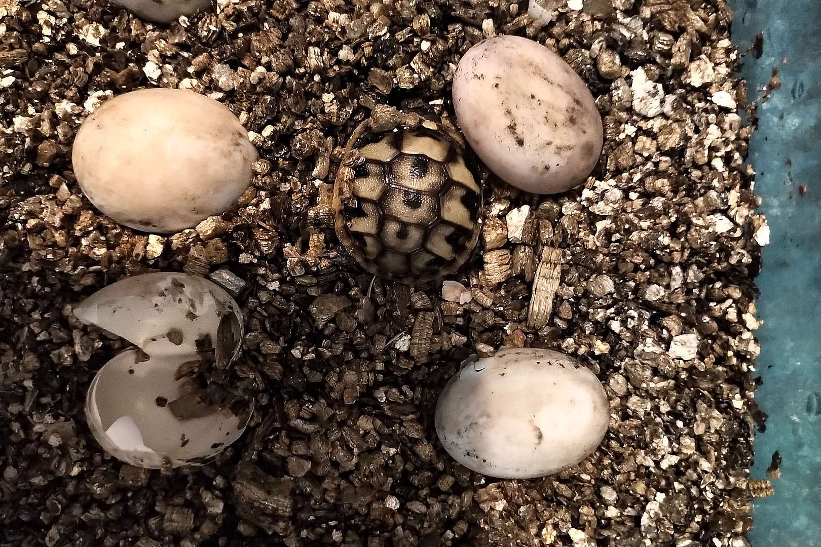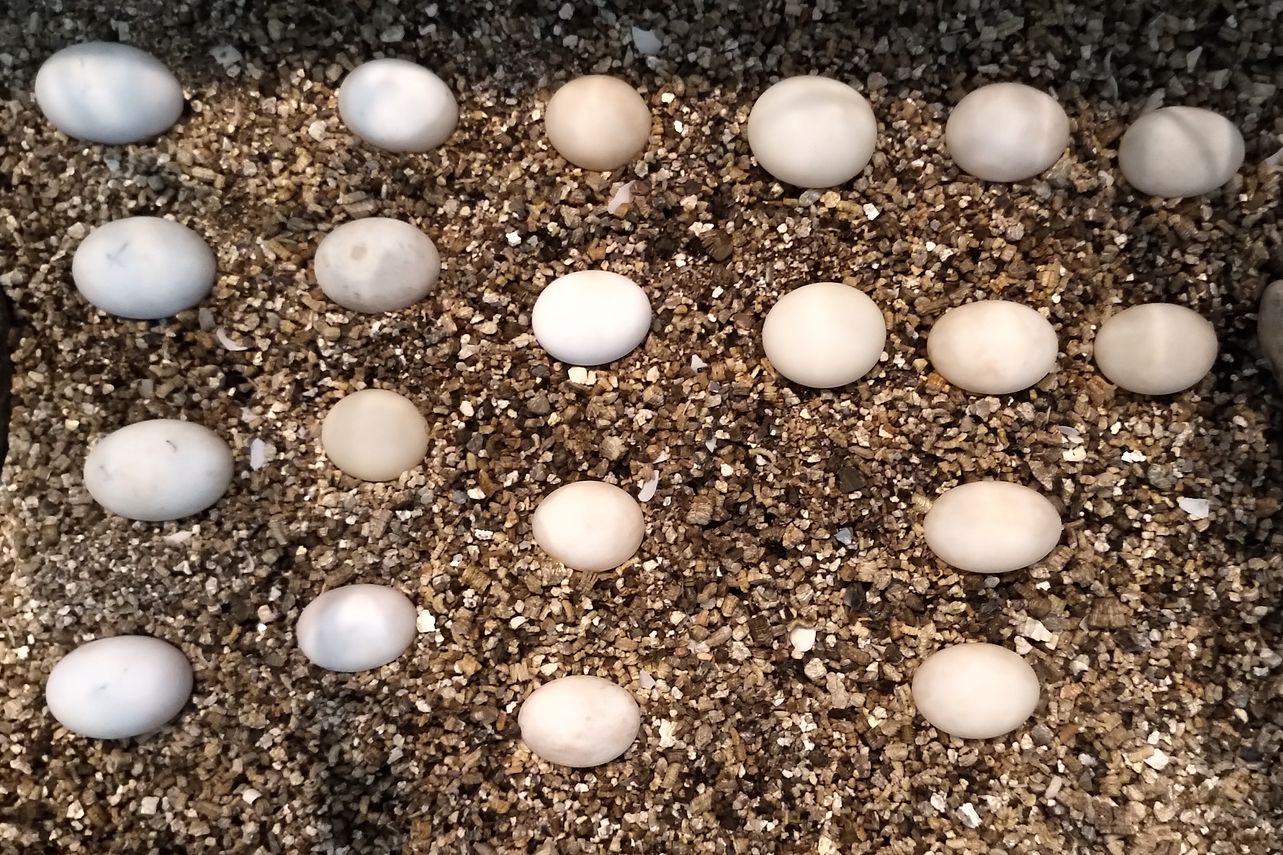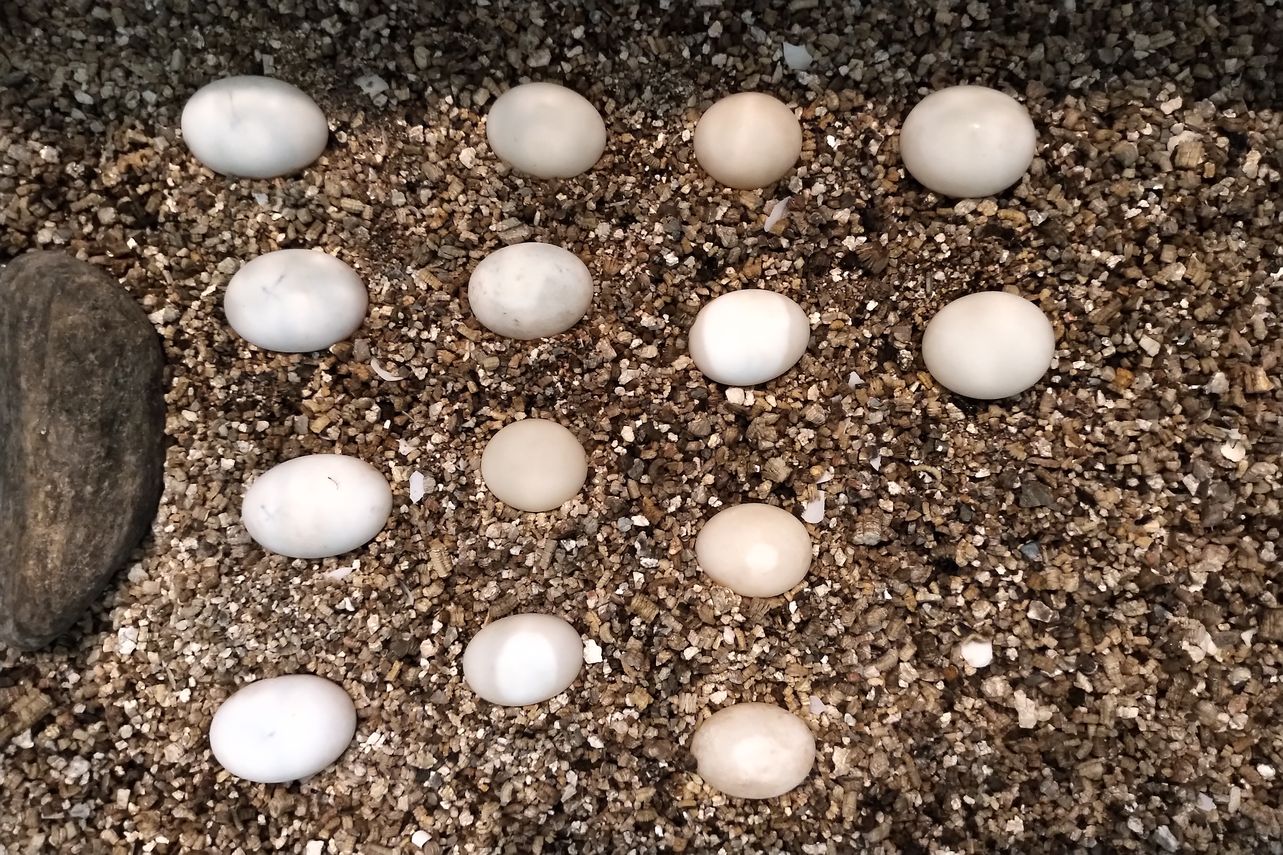 Takto vypadá snůška od dvou samic v červnu 2019. Větší vejce kolem 20 g jsou od samice s hmotností přes 800 g ve dvou snůškách po 2 týdnech (4+2). Paradoxně mnohem menší vejce kolem 12 g jsou od samice vážící přes 1600 g, zato všech 8 z jedné snůšky (a deváté se rozbilo při kladení).