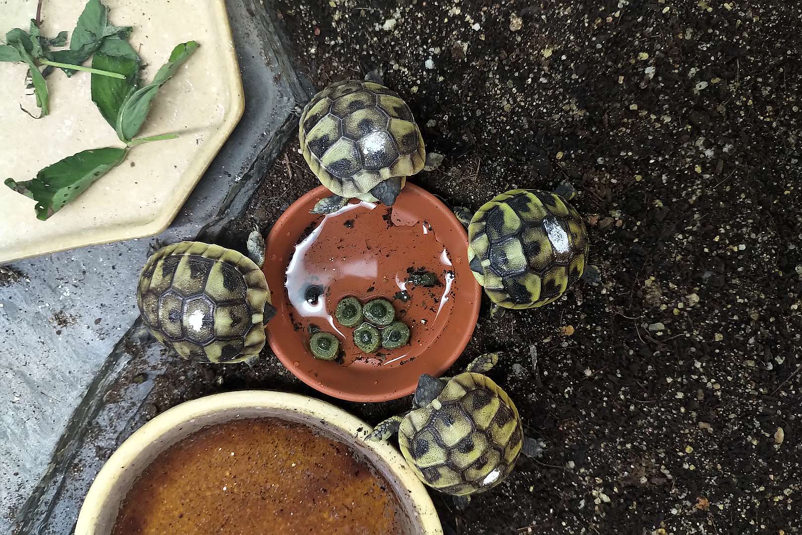 "Bazén" z vaničky od zmrzliny. Želvám koupání nevadí, naopak prospívá jejich zdravému vývoji.