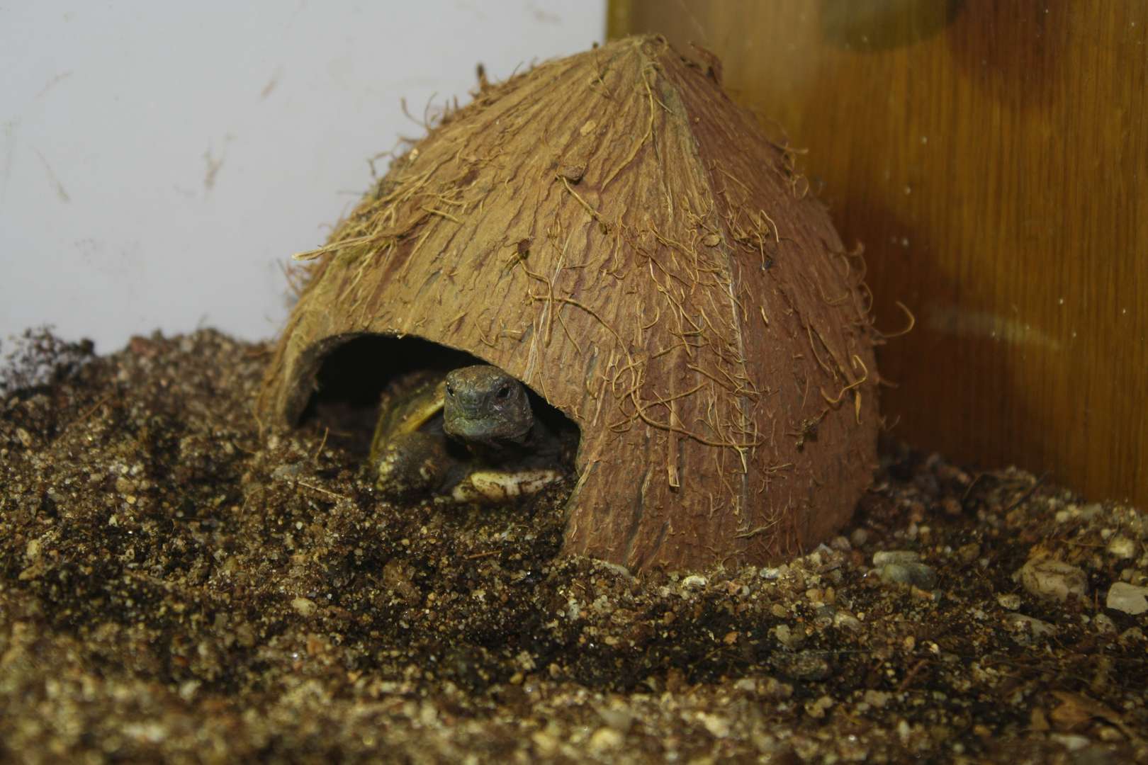Domeček z kokosového ořechu. Želvička Lilinka se v něm zabydlila hned první noc.